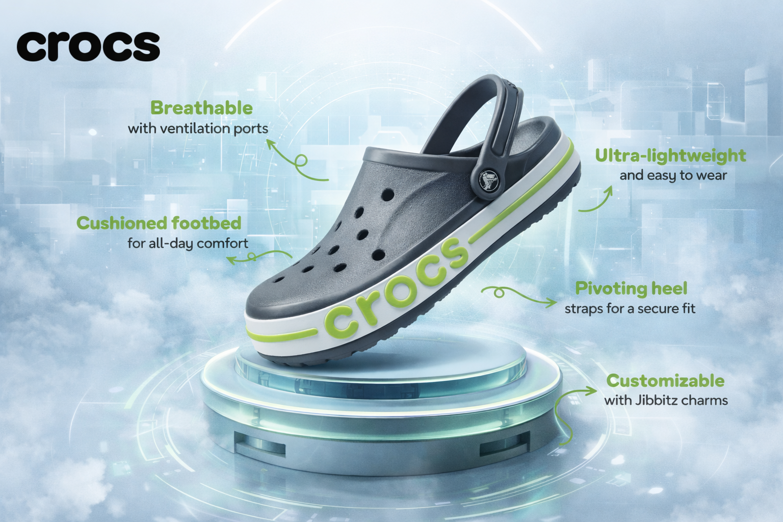 The Crocs Men Bayaband Casual Sandal combines sporty style with signature Crocs comfort. Made from lightweight Croslite™ material, it offers all-day cushioning and easy cleaning. The slip-on design with a pivoting heel strap ensures a secure and comfortable fit, while ventilation ports enhance breathability. Perfect for casual outings, travel, or everyday wear, these sandals provide excellent grip and durability on different surfaces. Designed for both style and practicality, they are ideal for men who value comfort and simplicity. Available in multiple colors like Black, Navy, and Grey, the Bayaband sandal delivers effortless cool with long-lasting performance.